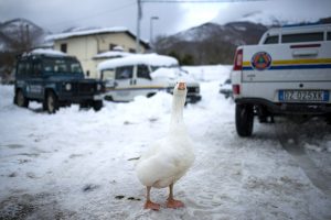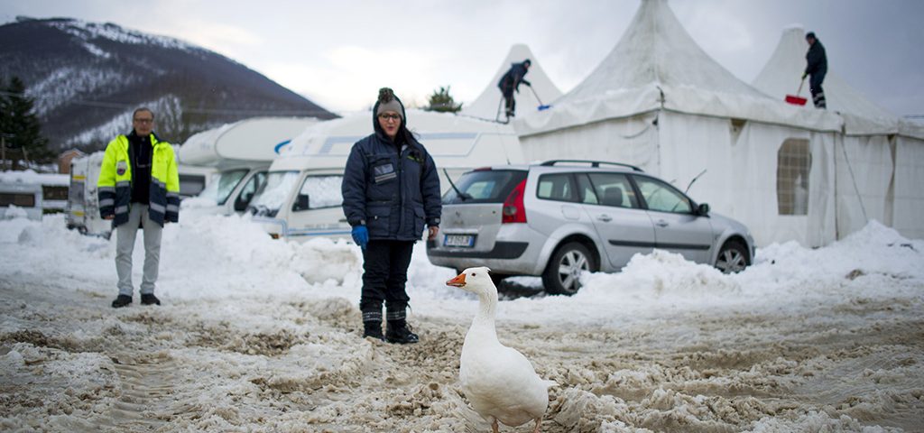 The long straight of the industrial area from the town of San Benedetto brings to this small village is a journey, unfortunately after August 24, 2016, to do with a lump in my throat. The closer you get to the town and the landscape changes due to the destructive fury of the earthquake; literally gutted houses, barriers that prevent you from entering the red zone and emergency vehicles and the army standing in for daily life of the villagers. The canteen, inside the camp run by the volunteers of Civil Protection of the Umbria region has become the new hub of San Pellegrino. Is Mrs. Cecilia always busy inside the marquee with volunteers and generous with stories and anecdotes about the country and then there’s Gwendolyn, the new element to be a bit ‘of months now, the element that makes smile even in the darkest days of winter. Gwendolyn runs in the field with its webbed feet from side to side and when new visitors are immediately in front of the cafeteria to wait for a nod of approval. Yes, because since the Gwendolyn goose has decided to live in the camp run by the Civil Protection everything has changed, everything has become almost lighter. The presence of an animal in an emergency such as an earthquake is certainly a reason to wander their thoughts toward elsewhere, if the animal is then a nice goose therapy is even more effective. “The story of Gwendolyn is as curious as it is extraordinary – says Alberto Cardaioli, the group PROCIV cook and volunteer Marsciano – initially were four and lived in a barn in the village of San Pellegrino then the earthquake caused serious damage to the structure with the removal of the family and of the peasants towards the hotels of Lake Trasimeno. One night a fox decided to raid the poor geese saving miraculously Gwendolyn which remained the last. The fox was in the following days to try to finish their work but the goose found in us His greatest protection, I still remember the night we all had a shield around Gwendolyn right to remove it from the grip of the fox. In the following days also we tried to tame the hunter who for some time came to eat with us, then disappear and not be seen again. Instead Gwendolyn is here with us now from November and does not want to read out of the field. ” Immediately after the death of the other various geese volunteers tried to bring the cute animal to his barn but on time in the morning when you wake up if they found themselves in the middle of the field or in front of the canteen, so he understood the animal’s intentions. The name came from